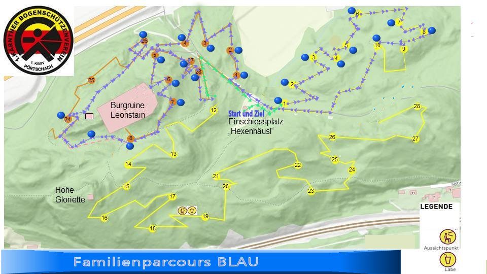 Unsere „light“-Variante ist mit blauen Pfeilen und blauen Nummerntafeln gekennzeichnet. Start ist beim Hexenhäusl am gelben Parcours mit Ziel 1. Auf den ersten 10 gelben 3D-Zielen wird nur Ziel 9 (Krokodil, Bergabschuss) ausgelassen. Zurück beim Hexenhäusl geht es am orangen Parcours mit den Zielen 1 – 8 weiter. Über die markierte Abkürzung gelangt man über Ziel 18 blau zu den Zielen 24 – 28 orange. Nach dem letzten Ziel 28 orange ist man nach einem kurzen Wegstück wieder zurück beim Hexenhäusl.