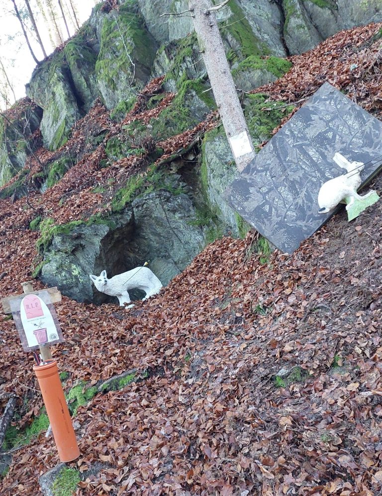 Der "Angsthase" ist mit einem Backstopp versehen, der "mutige" Bogenschütze riskiert aber den Schuss auf den Fuchs vor der Steinhöhle ohne Backstopp - bei Fehlschüssen gibt's manchmal zerbrochene Pfeile .......... und dafür hat unser Pfeilfriedhof immer geöffnet.
